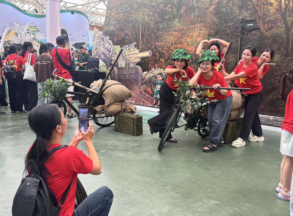 Du khách lưu lại khoảnh khắc trải nghiệm xe đạp thồ tại gian trưng bày của tỉnh Điện Biên.