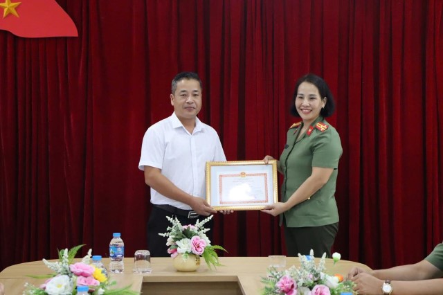 Thượng tá Chu Thị Minh - Phó trưởng phòng An ninh chính trị nội bộ - PA 03, Công an tỉnh Điện Biên trao giấy khen cho đồng chí Phạm Văn Thắng