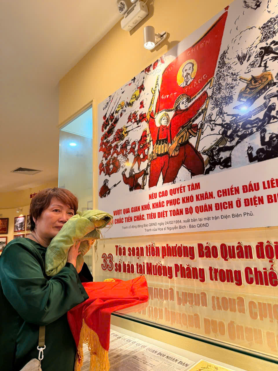 Trong không gian trưng bày về Tòa soạn Tiền phương Báo Quân đội nhân dân, bà Nguyễn Thị Hồng Trinh – con gái cố Họa sĩ Nguyễn Bích nghẹn ngào nâng niu chiếc chăn kỷ vật cha bà