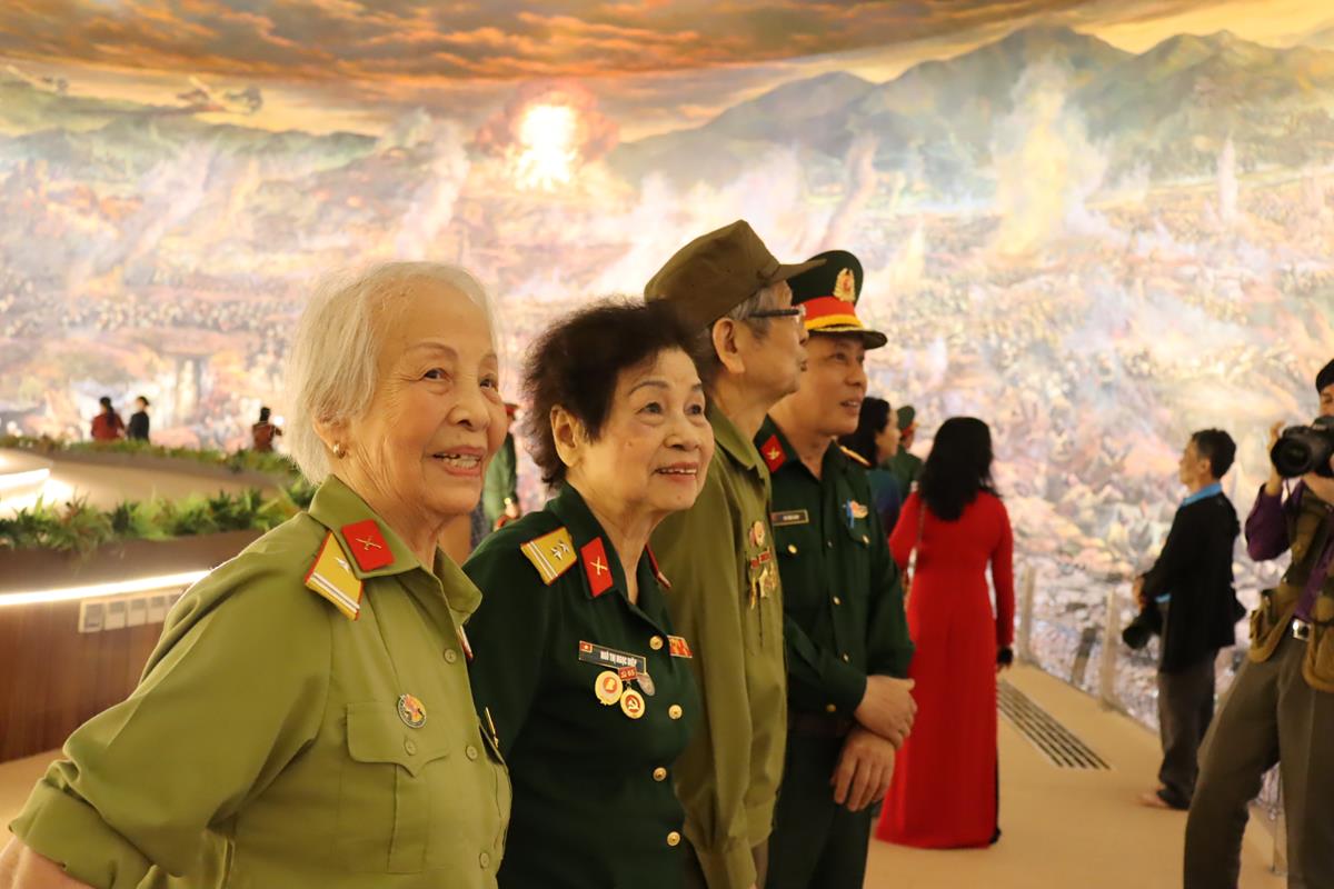 Trung tá, NSƯT Ngô Thị Ngọc Diệp và bà Vũ Thị Lương tham quan bức tranh Panorama "Chiến dịch Điện Biên Phủ
