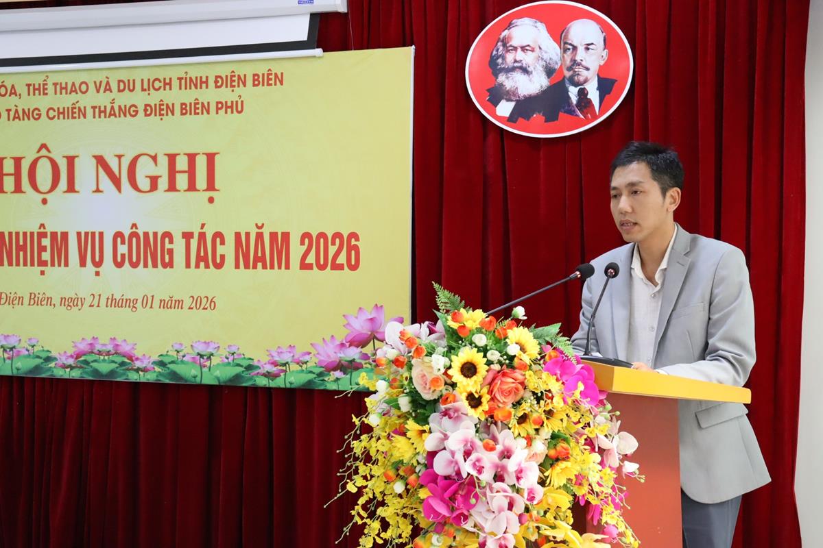 Phát biểu tại Hội nghị, đồng chí Đào Duy Trình – Trưởng phòng Quản lý Di sản Văn hóa đã ghi nhận, biểu dương những kết quả đạt được của Bảo tàng trong năm 2025, đồng thời chỉ ra một số tồn tại, hạn chế cần khắc phục. Đồng chí đề nghị trong năm 2026, viên chức Bảo tàng tiếp tục nâng cao trình độ chuyên môn, đẩy mạnh đổi mới hoạt động nghiệp vụ, tổ chức các sự kiện, chương trình giao lưu gắn với chức năng, nhiệm vụ của đơn vị nhằm thu hút khách tham quan; tăng cường hợp tác quốc tế trong lĩnh vực bảo tàng, góp phần gìn giữ, phát huy giá trị lịch sử Chiến thắng Điện Biên Phủ và quảng bá hình ảnh tỉnh Điện Biên, Việt Nam ra thế giới.